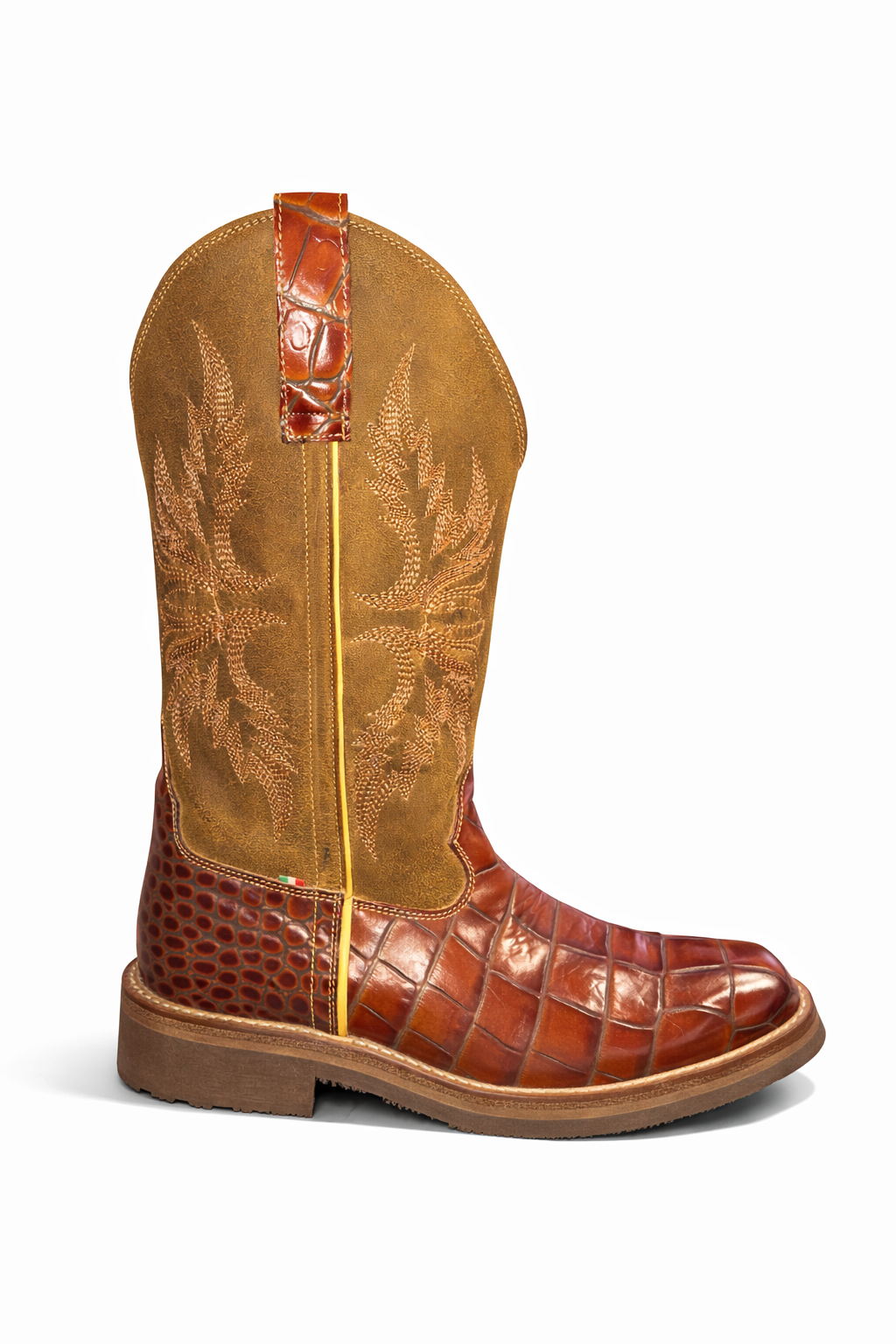 Linea Elite, realizzata con una stampa coccodrillo bordeaux sul piede e gambale ricamato color sabbia.