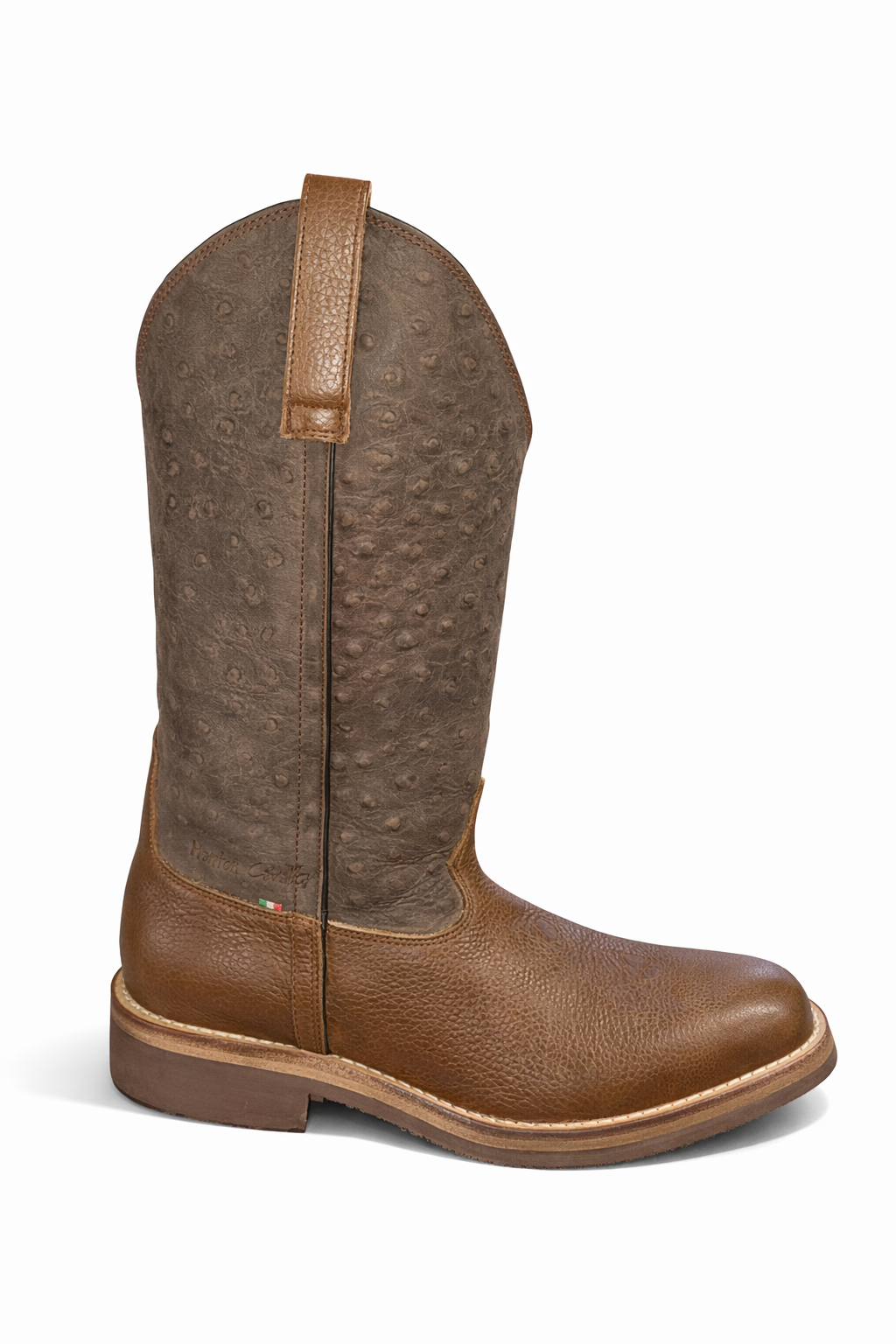 Stivale della linea Elite, caratterizzato da un gambale in pelle stampata effetto struzzo in tonalità marrone caldo e da un piede in pelle liscia marrone scuro.