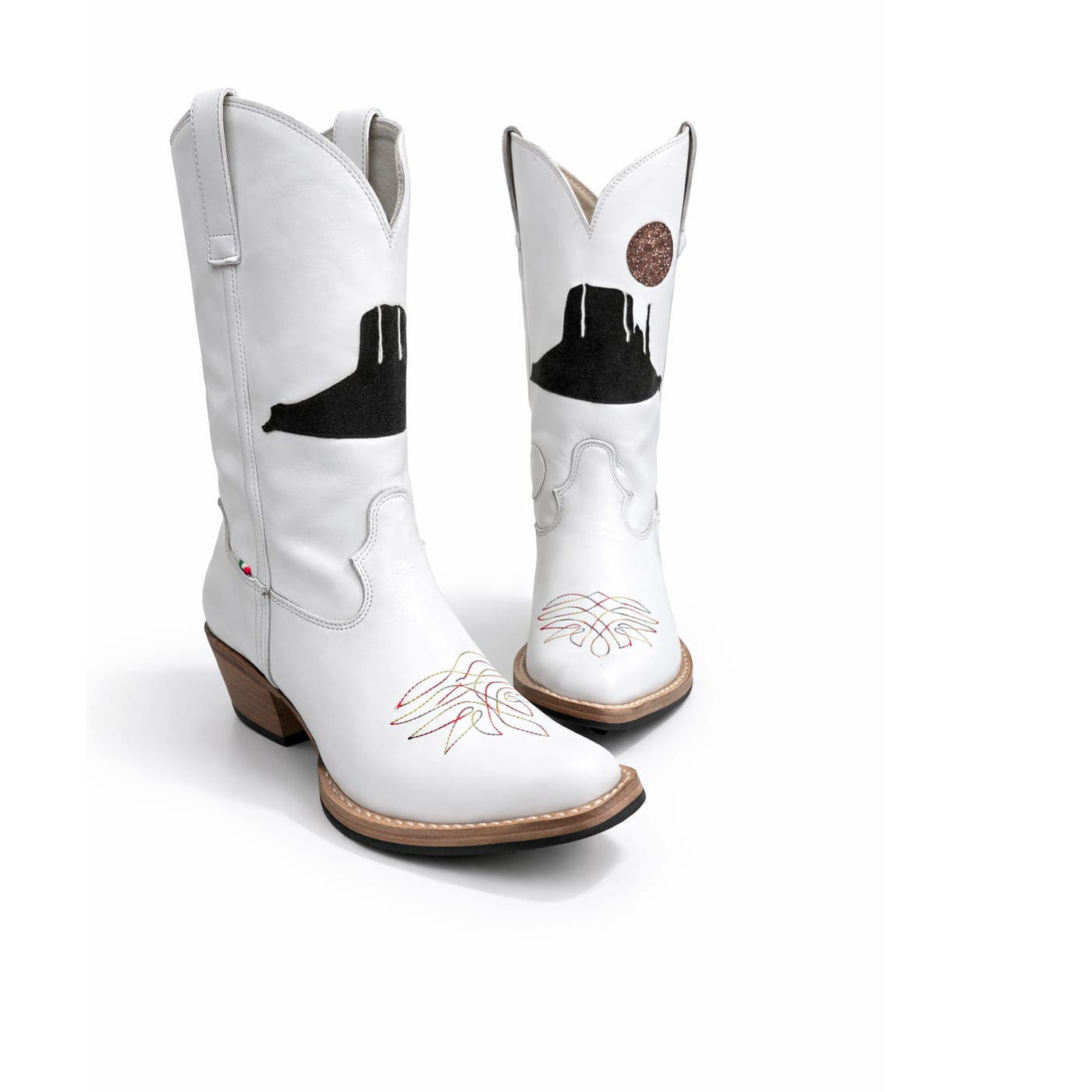 Stivali da ballo country in pelle bianca con inserto Desert Scene. Suola in cuoio con inserto in gomma antiscivolo, progettata per garantire scorrevolezza e stabilità su ogni tipo di pista. Modello leggero, flessibile e confortevole, ideale per il ballo country.